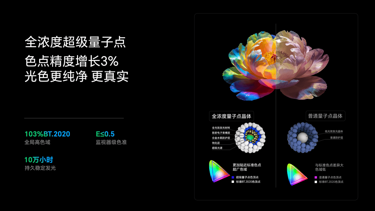 为了充沛开释这块屏幕的潜力,创维A10H Pro选用了SQD-Pro第二代超级量子点技能,完成了大局高色域的安稳体现,BT.2020色域掩盖高达103%;独家搭载的「1nm真彩滤光层」更能够精密过滤杂光,使颜色纯洁度大幅度的进步47%,鲜活展示更多颜色。