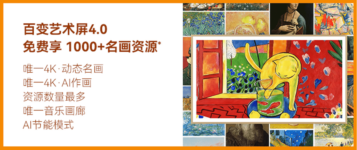 壁纸电视即便在不必的时分,也不该该是一块“黑屏”,而是要像真实的画作相同悬于墙面。为此,创维A8H系列内置了职业抢先的「百变艺术屏4.0」,超越1000幅国际经典名画均可终身免费运用,让墙面变身活动的“家庭艺术展”,轻松“拿捏”客厅艺术气氛。